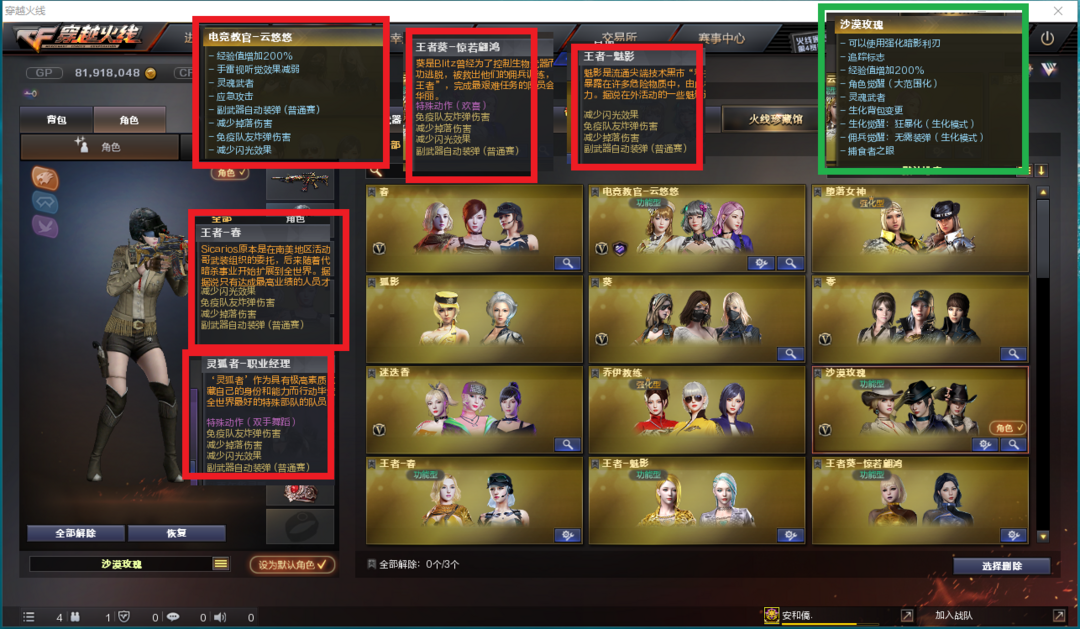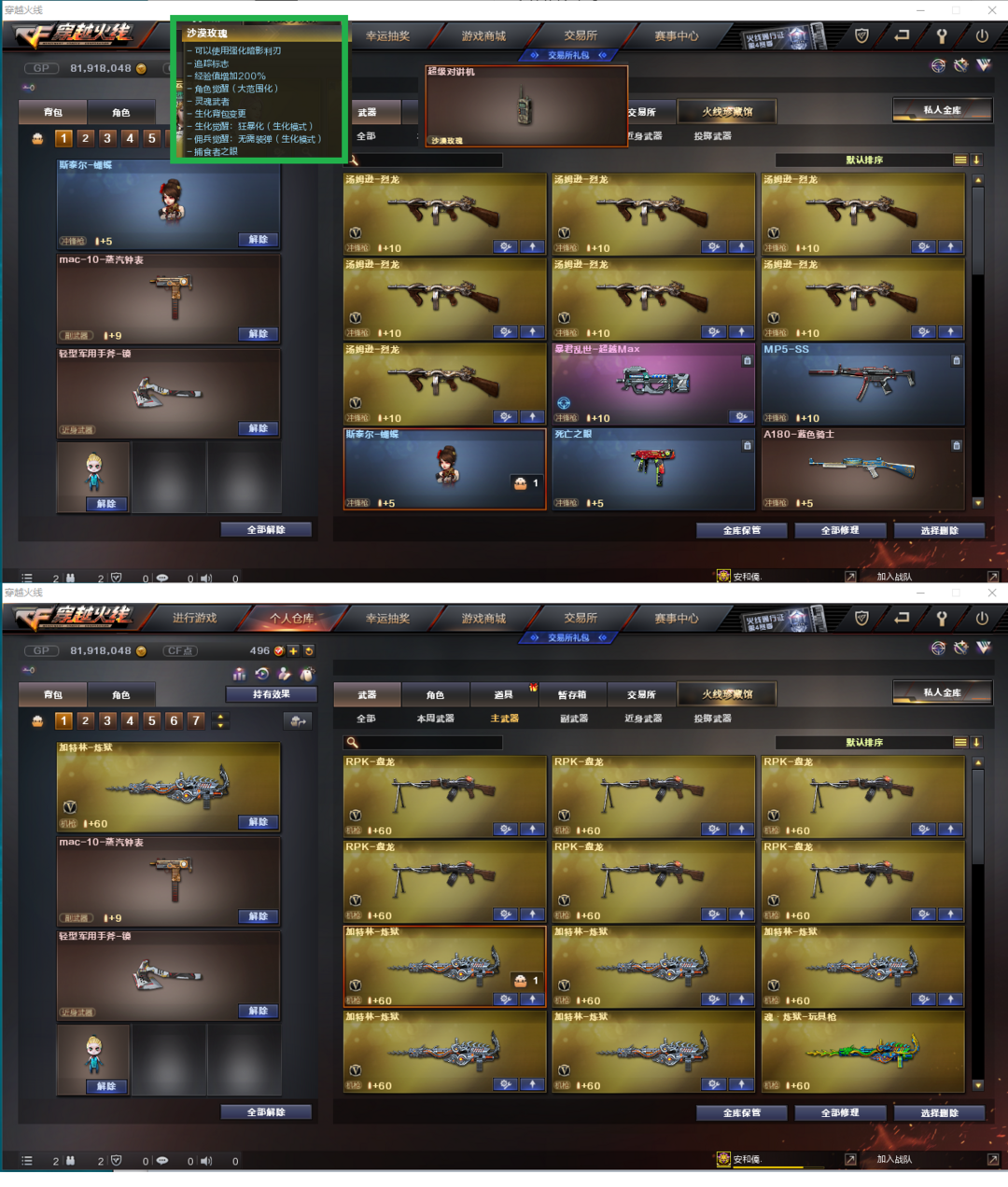 装备描述:排位:可以----------生化全装极品(生化背包变更、可以查看生化僵尸血量):无需换弹、6烈6盘、炼狱、斯太尔-蝴蝶、死亡之眼、MAC-涂鸦、手斧镜、生化减速雷、超级对讲机、全部弹匣、、、、、爆破四防:幻神音效4皮(宠儿、N9、周瑜、丹凤)、王者幻神、98K星神、M200-竞技荣光、、、2个USP雷暴、荣耀世冠柯尔特、竞技荣光柯尔、COP雷霆、COP堕天神、COP幻灵、COP雷霆王者、、、、传说暗裔、G36C幻影、白虎、QBZ金色蔷薇、荣耀世冠火麒麟、荣耀世冠雷神、、、2套雷霆、6套雷暴、7套堕天神、4套夜魔手雷、、、、、爆破四防(云悠悠、王者春、王者魅影、王者惊若翩鸿、职业经理、莎莎)、生化四防(沙漠玫瑰)