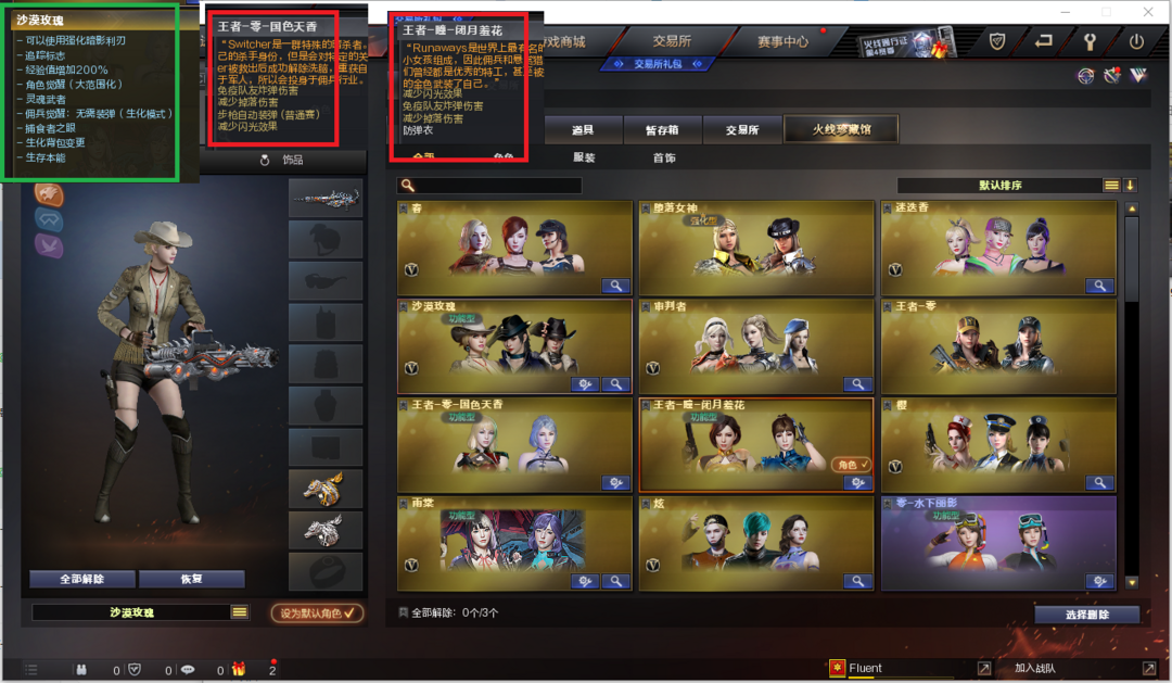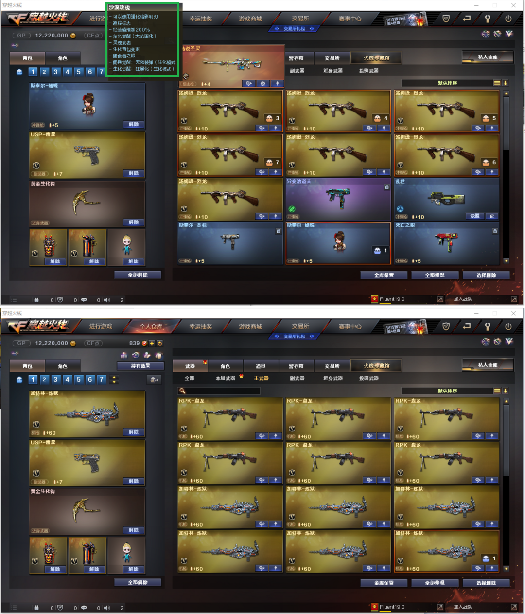装备描述:排位:可以-------------生化全四防装(变更生化背包、可以看僵尸血量):无需换弹、6烈龙、6盘龙、斯泰尔蝴蝶、异变清道夫、生化黄金钩子、生化减速雷、超级对讲机、全部弹匣、、、、、、、、爆破四防:幻神(冠军之幻)、2个SUP雷暴、3个COP堕天神、COP雷霆、COP幻灵、传说暗裔、传说圣灵、星神、白虎、王者蔷薇、王者冰魄、王者火魄、、、、裁决音效、毁灭音效、黑龙音效、雷神音效、极光音效、火麒麟音效、黑骑士音效、、、7套雷霆、7套雷暴、7套堕天神、3套夜魔、7套电竞装甲、1套幻灵、、、、生化四防(沙漠玫瑰)、爆破四防(王者国色天香)