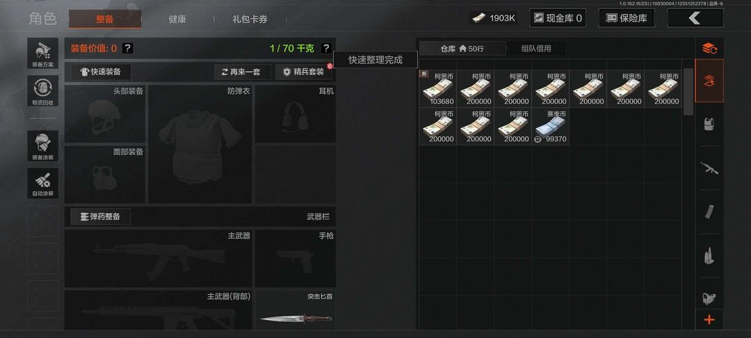装备描述:仓库总价190万纯柯恩币,还有全装包