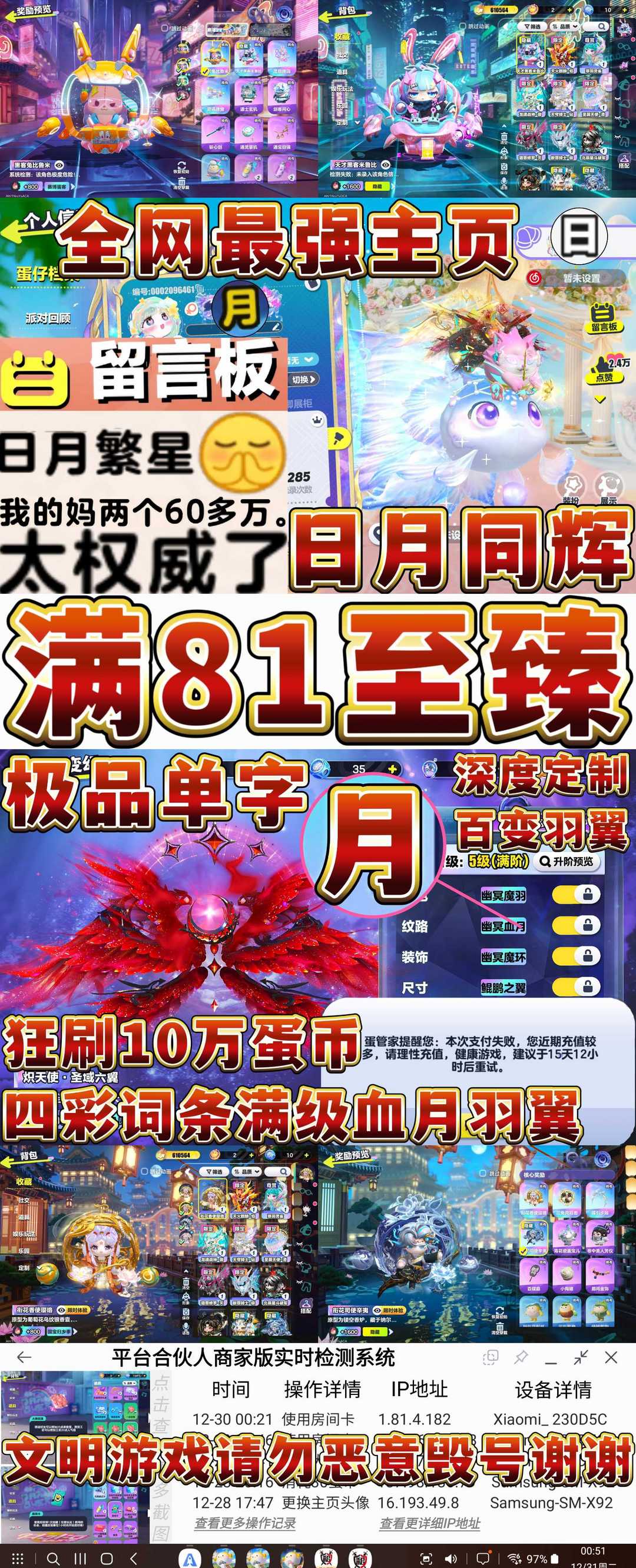 全皮×全网最贵单字ID月(6W)×日月同框130万潮×血月羽翼定制⚡云⚠️恶意撤单局内直退全平台拉黑