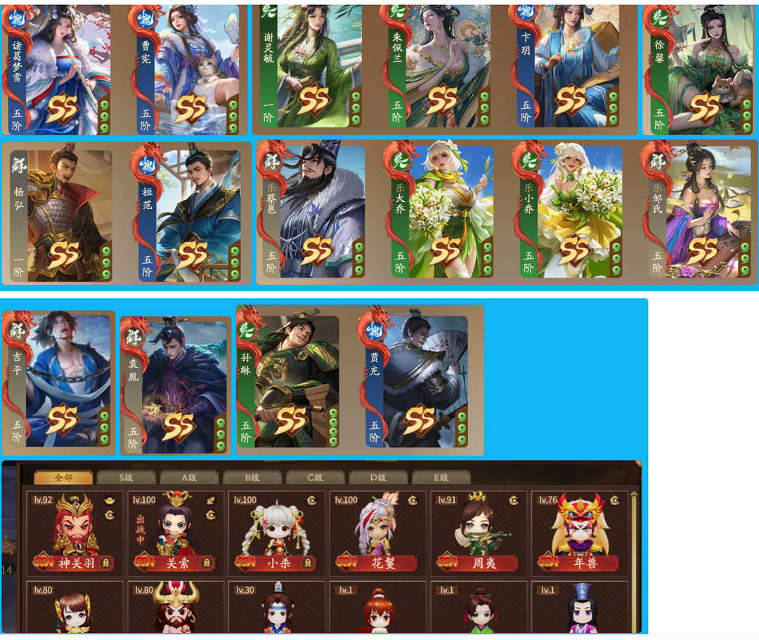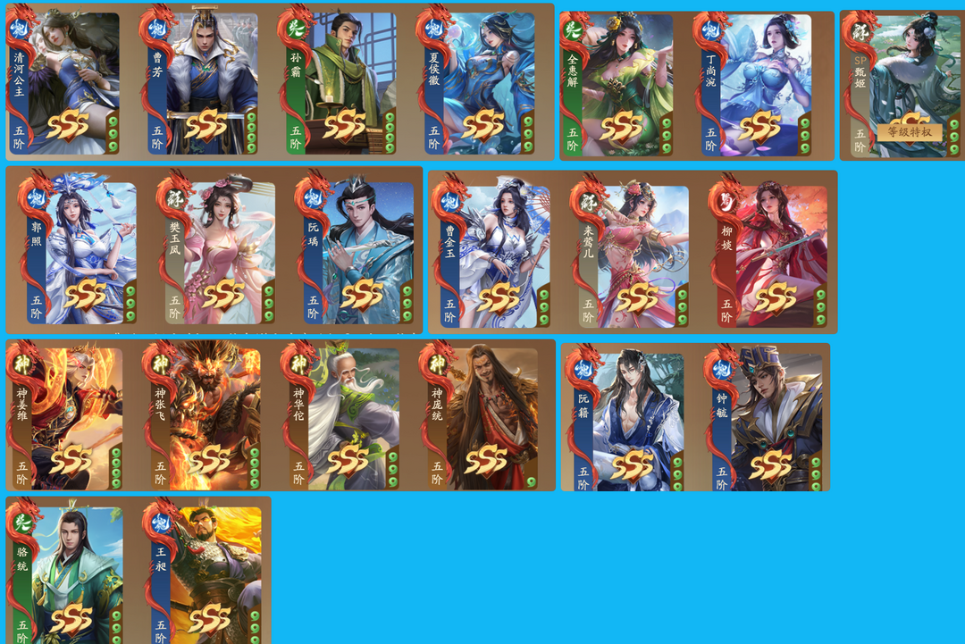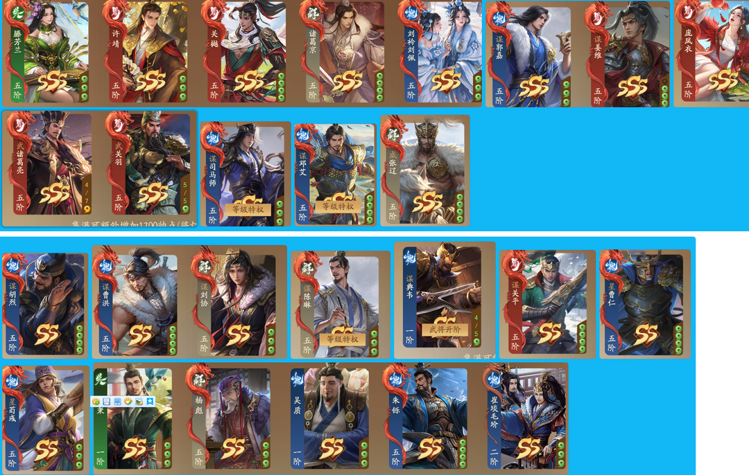 限制: 租号3次及以上 | 撤单率<70%才可租用此帐号装备描述: 电脑手机都可以玩(不分安卓苹果),如果下单了看到有人在的话直接顶,应该是上一单结束但那个人还在玩,只要下一个人没上可以继续玩儿,白嫖时间肯定多的 主要武将:武诸葛亮 武关羽 威张辽 谋姜维 谋郭嘉 神张飞 神华佗 谋郭嘉 柳婒 卞玥 周宣 许靖 关樾 腾芳兰 张璇 薛灵芸 柏灵筠 袁胤 诸葛京 房风衣 曹芳 司马师 孟优 谋司马师 谋关平 星曹仁 星袁术 关索 曹婴 朱建平 曹金玉 许劭 管宁 留赞 杨仪 杨彪 曹宪 赵昂 丁妈 周不疑 赵直 李丰 董昭 阮籍 张曼城 藤公主 芮姬 桓范 杜夔 贾充 张瑶 乐大乔 王昶 蒲元 孙寒华 刘巴 王烈 三次袁 庞会 吉平 阴间基本都有动皮 点将卡换将卡手气卡上千个,斗地主金豆几万,随时会补充,但请不要浪费,东西别乱动,玩得时候不要逃跑谢谢1