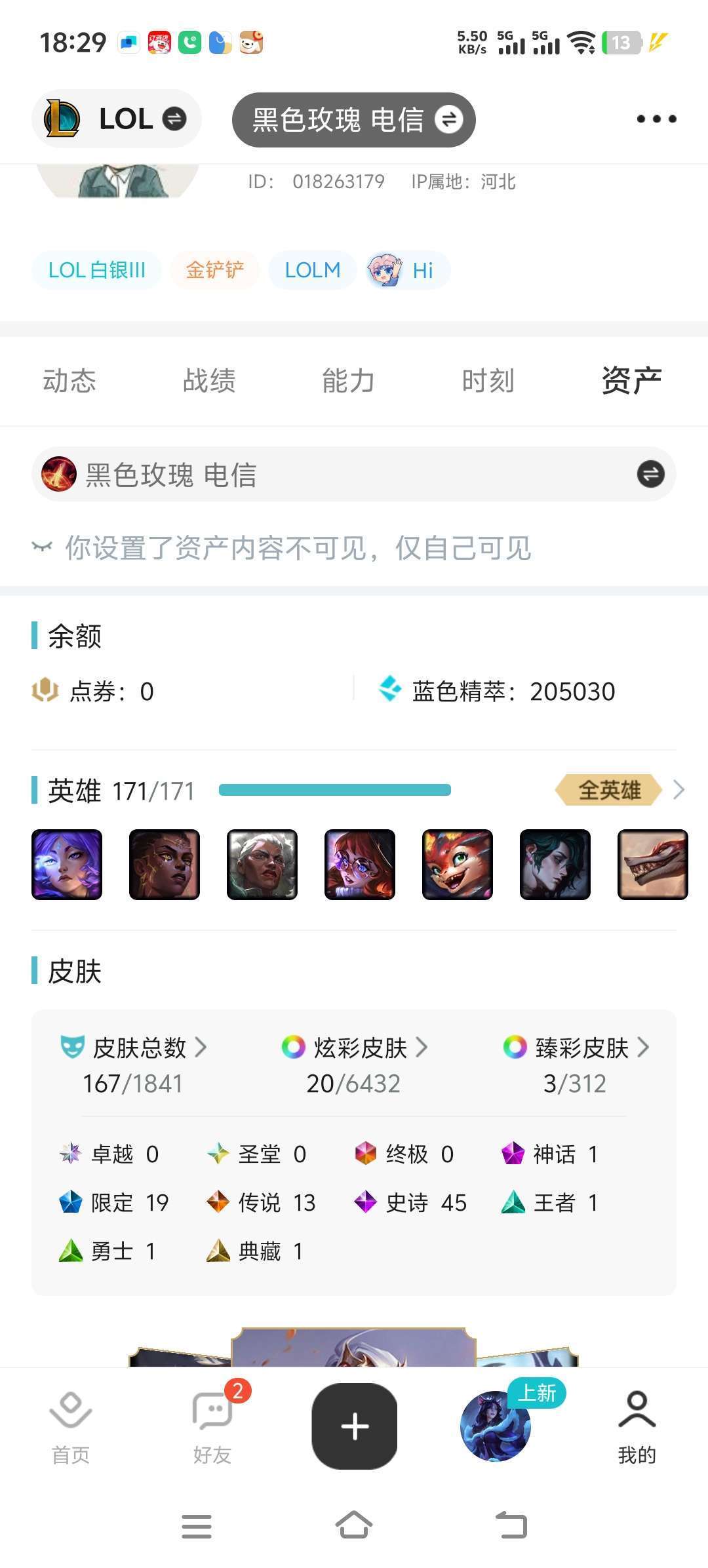 装备描述:《黑色玫瑰》 带妹小号‖171英雄‖167皮肤