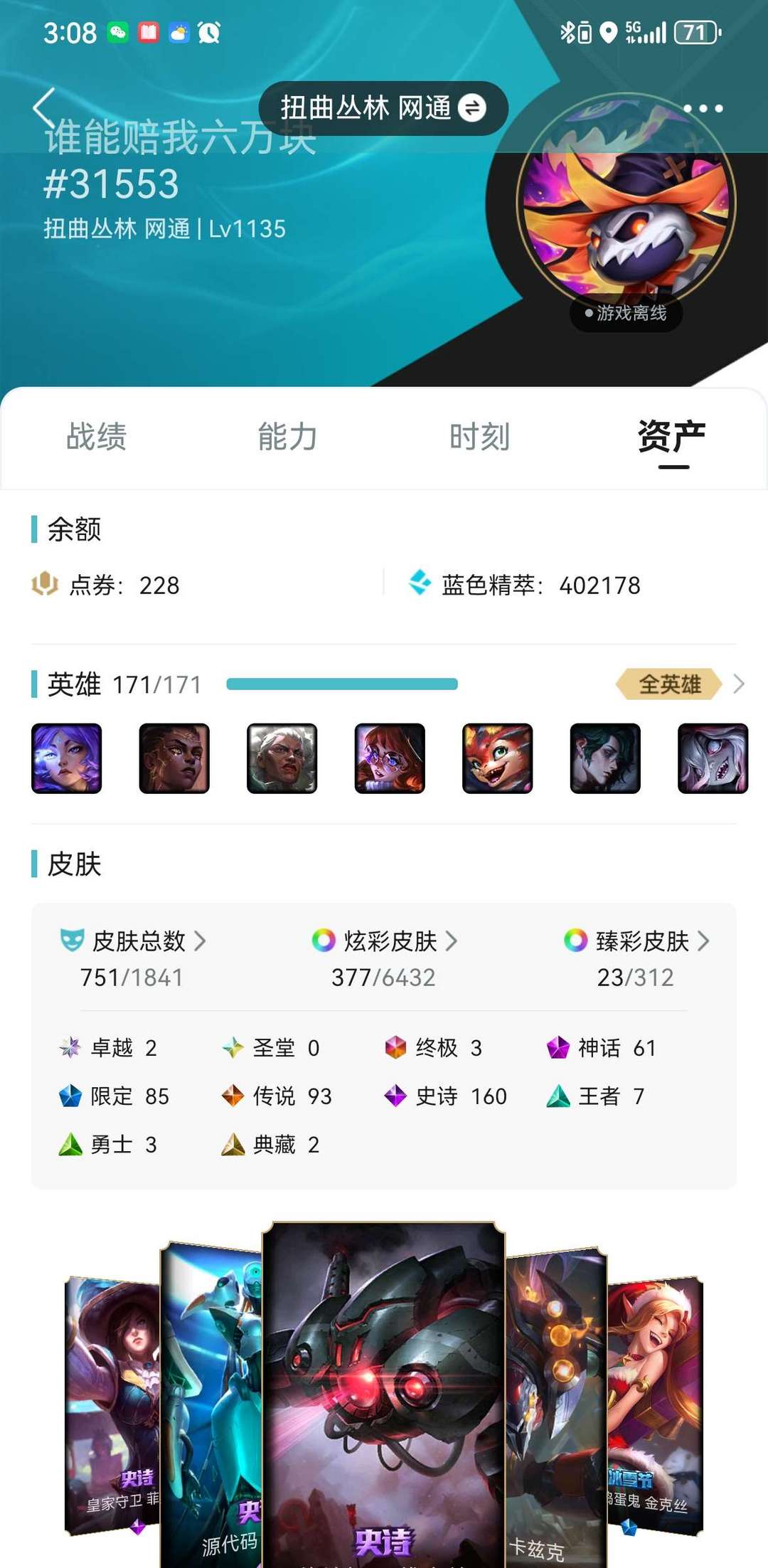 2卓越3终极61神话85限定总皮肤七百多。希望你们认真对待每一局游戏,这是我的青春回忆