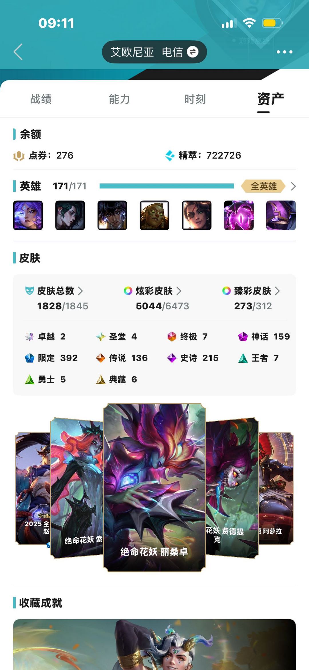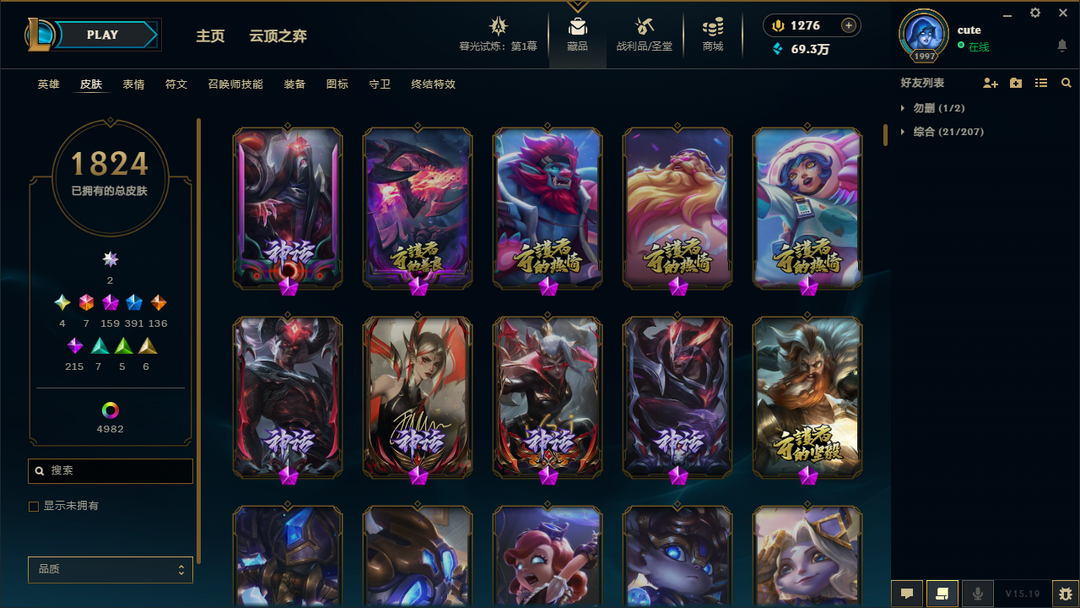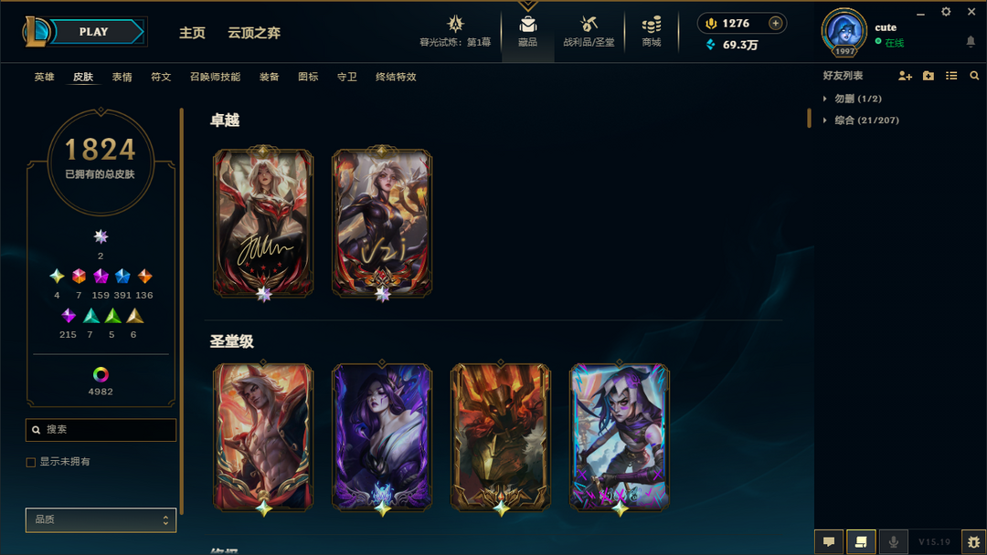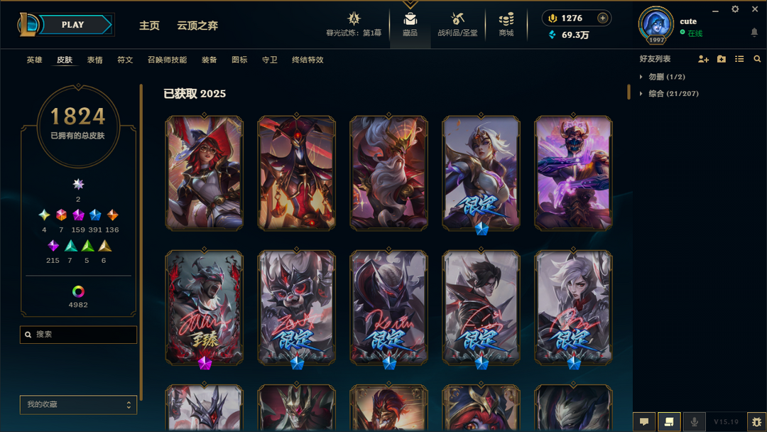 艾欧尼亚❤全神话❤全圣堂❤皮肤1828❤炫彩5044❤臻彩294❤名人堂狐狸名人堂卡莎❤云顶神话73