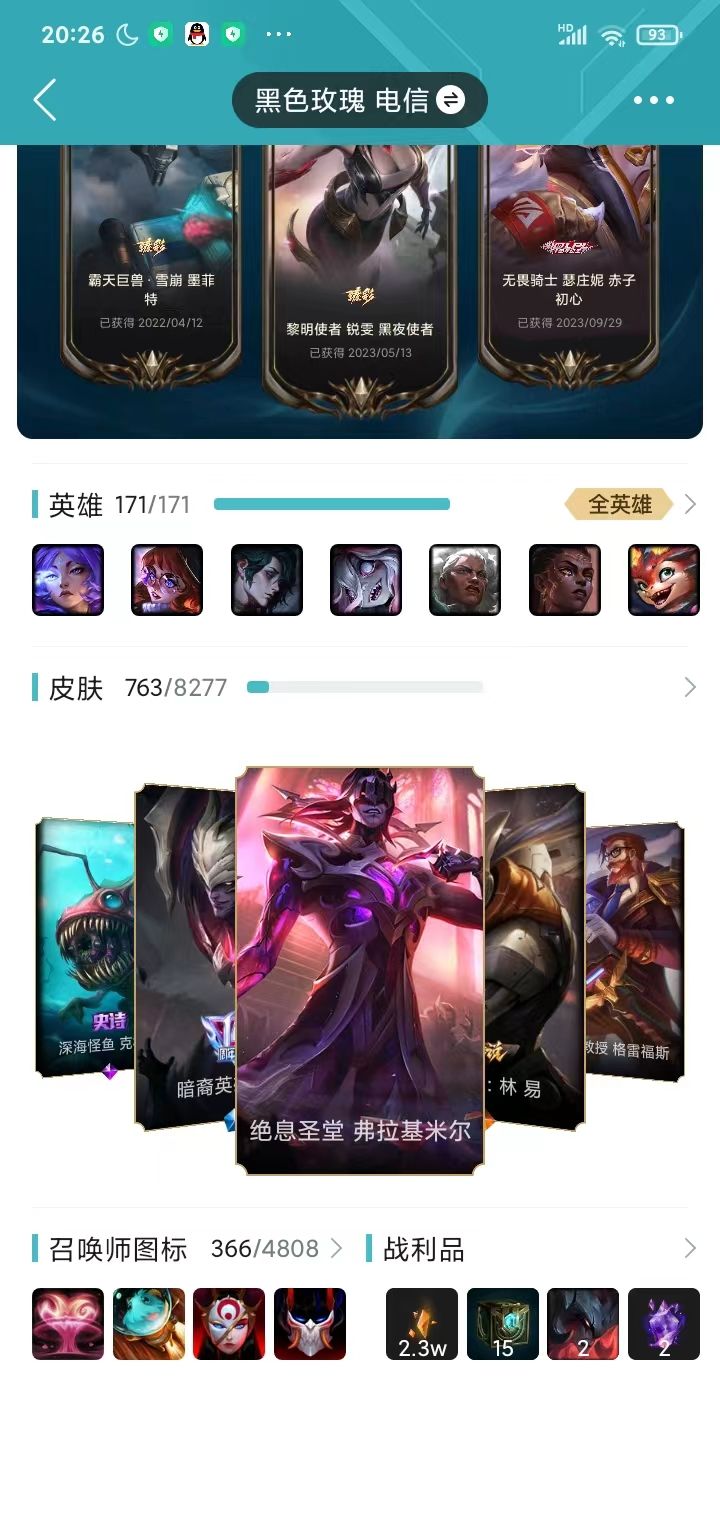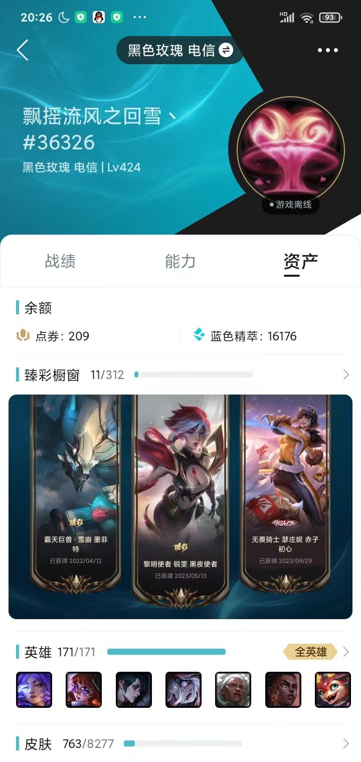 581皮肤❤️182炫彩❤️11臻彩❤️14神话❤️95限定❤️50传说❤️171英雄