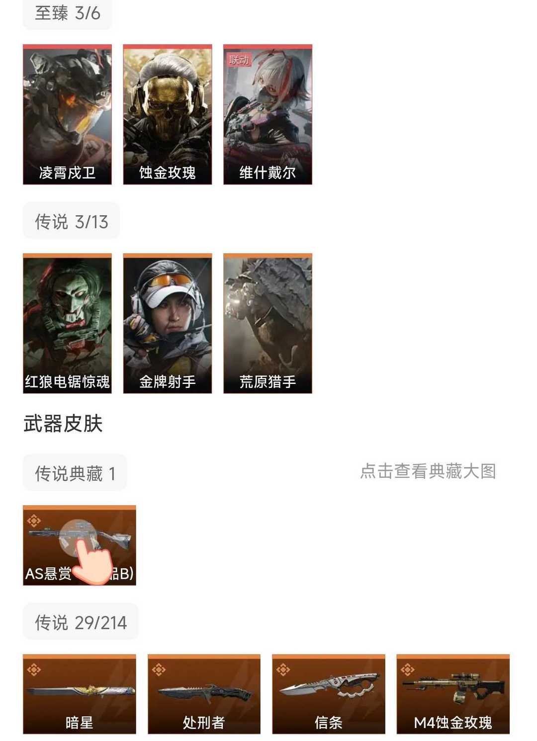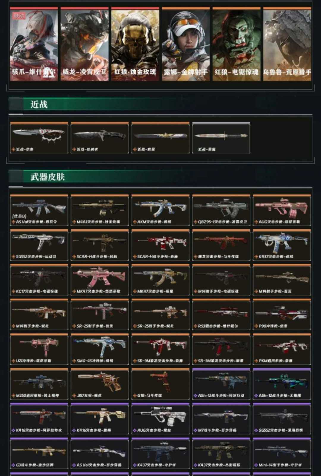 皮肤号 暗星信条凌霄戍卫,蚀金玫瑰,维什戴尔,29款传说枪皮,s8赛季3×3保险,as典藏枪