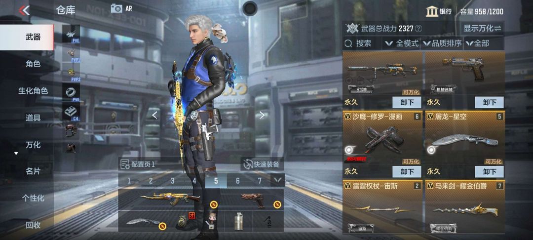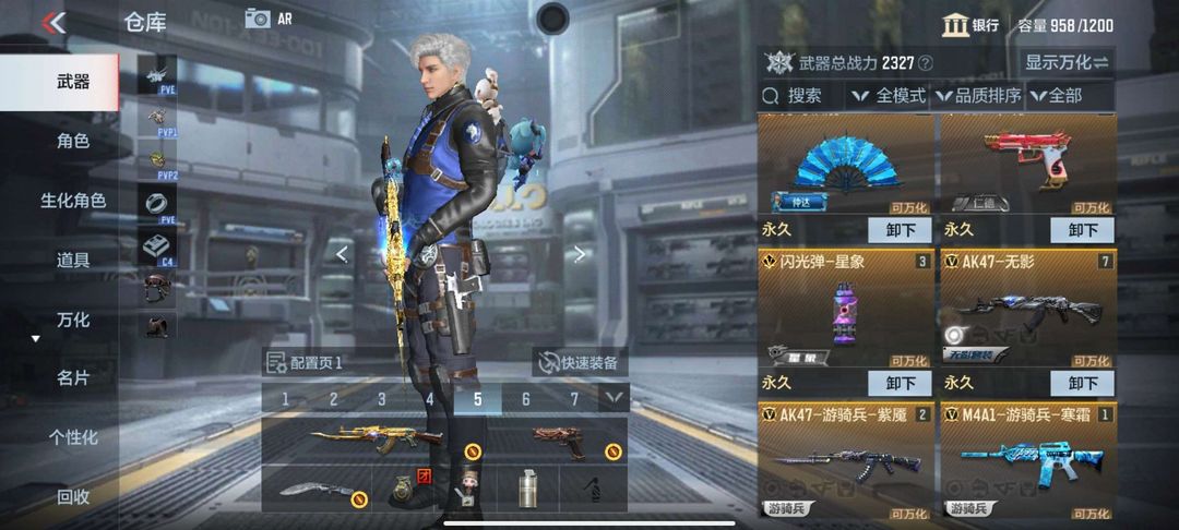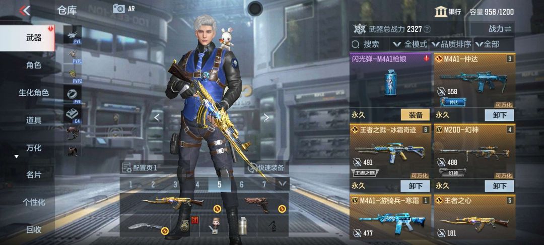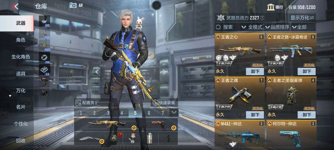 装备描述:王者之戳皮肤冰霜奇迹,王者心,m4游骑兵寒霜,ak游骑兵紫魔,仲达一套,