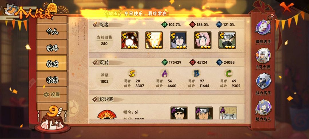 ⭐1000W战力⭐v11⭐249忍⭐28s⭐55a⭐妖怪纲手⭐仙人巳月⭐金身水门⭐六尾鸣人⭐白面具