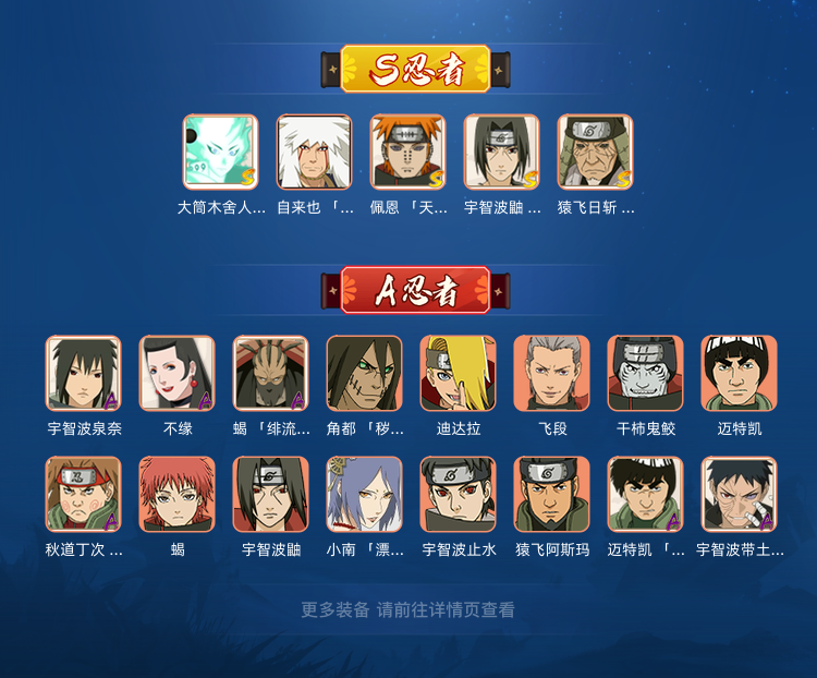 装备描述:漂泊带土,漂泊小南,忍战迈特凯,大筒木舍人,绯流琥蝎,秽土角都