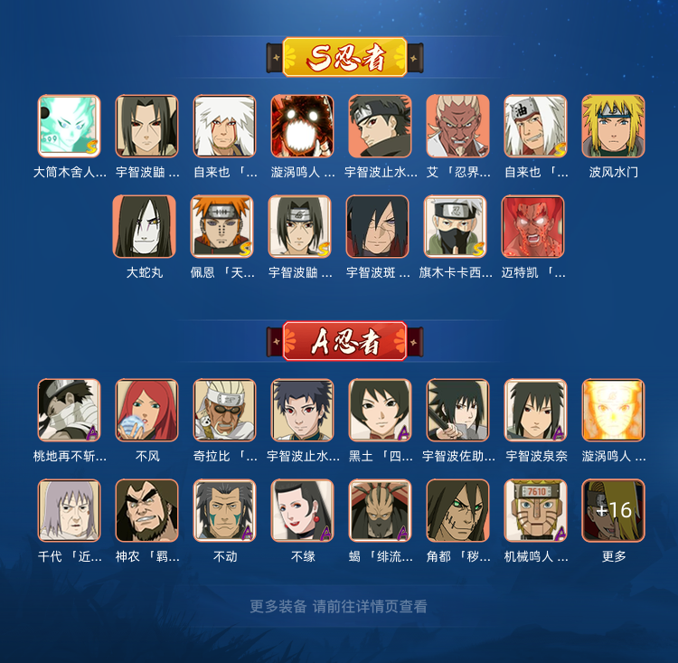 装备描述:漂泊带土 秽土鼬 舍人 须佐止水 双神威卡卡西 死门凯 新春止水 解斑 黑土 骨架 忍艾 金鸣 桃博以后忍者也全会有也会慢慢补old而且最便宜最实惠,亲~记得给个好评哈,么么哒