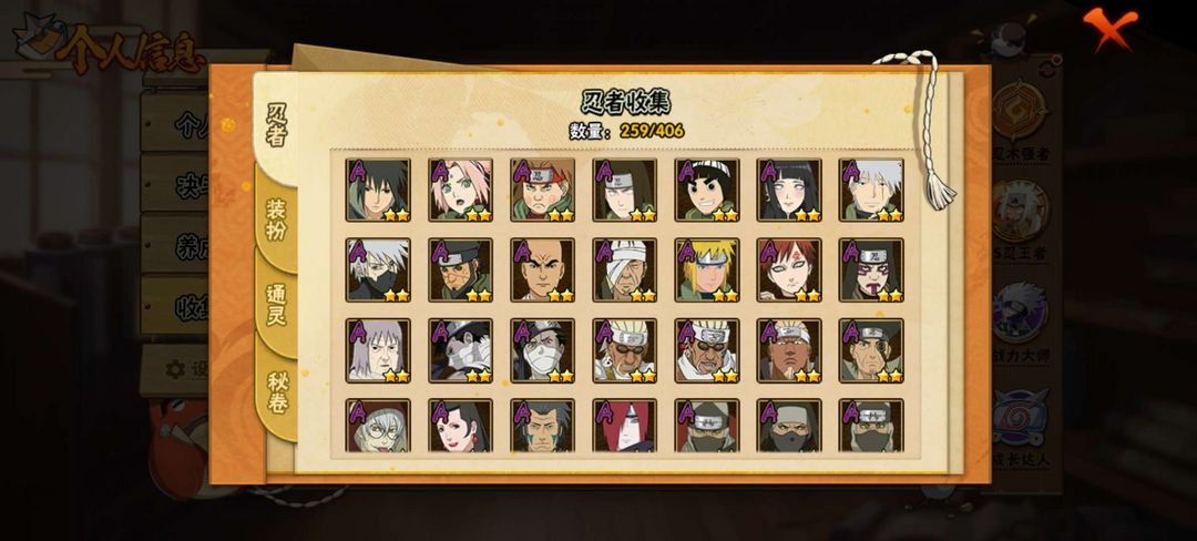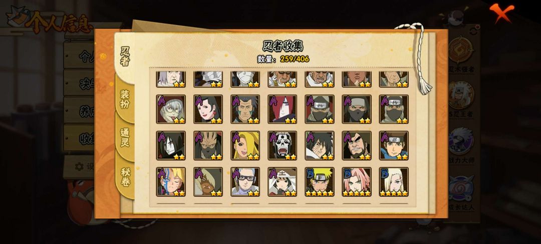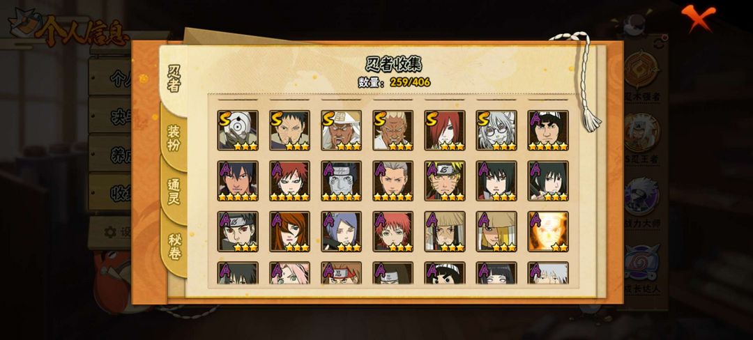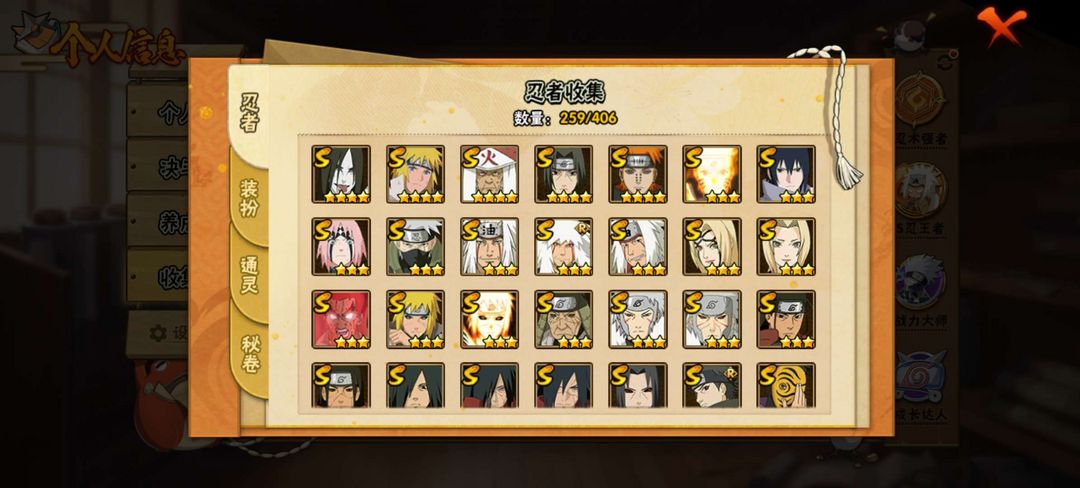 装备描述:全部高招a跟高招s都有 忍法帖有须佐止水。一共260个忍者