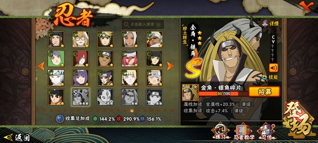 除金角外全s,战力2700,盾狗,漂泊全系列都有 通灵有熊猫螃蟹,高招全有,还有黑绝新春南这些