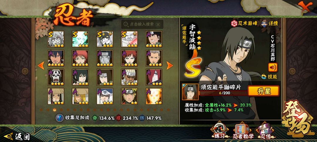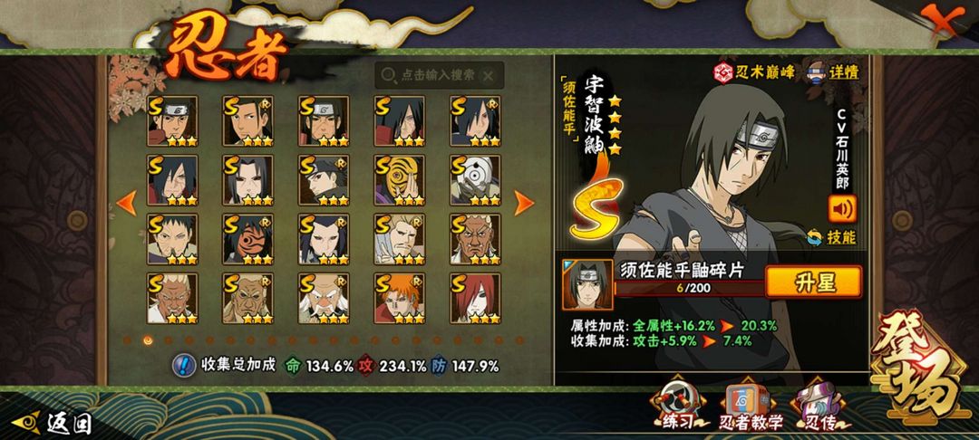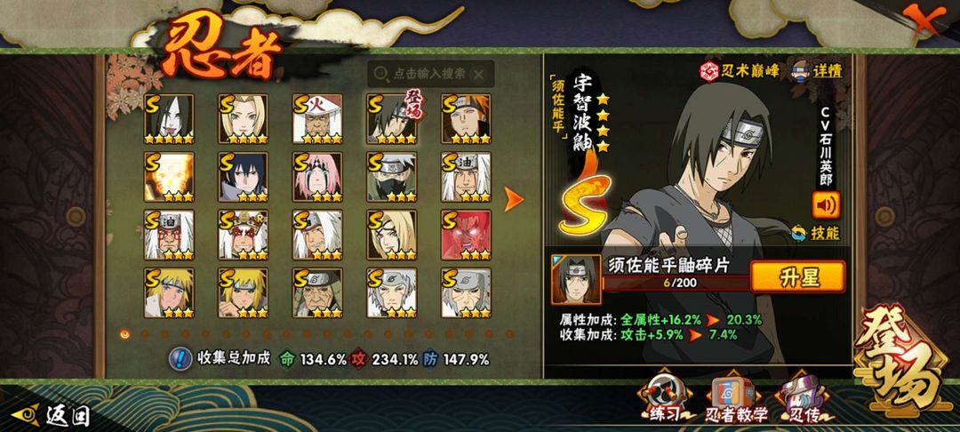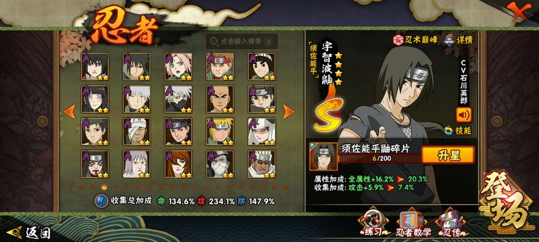 装备描述:侠影佐助已秒✨40S多A忍✨须佐止水✨忍战雷影✨百战佩恩✨秽土鼬✨2400w