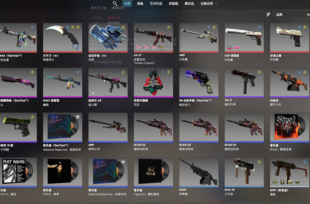 完美绿色A+,运动手套双栖,淬火全黄爪子刀+ak血腥运动+金蛇缠绕m4+印花集awp+印花集全套