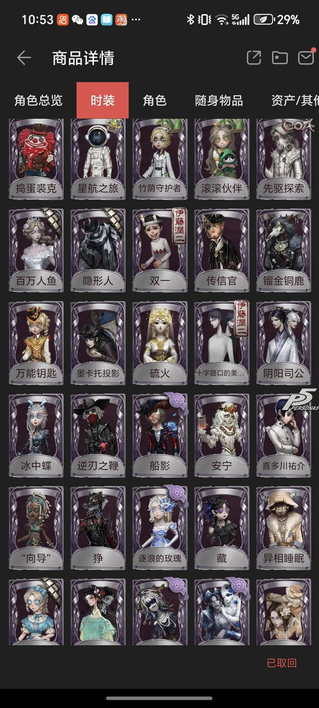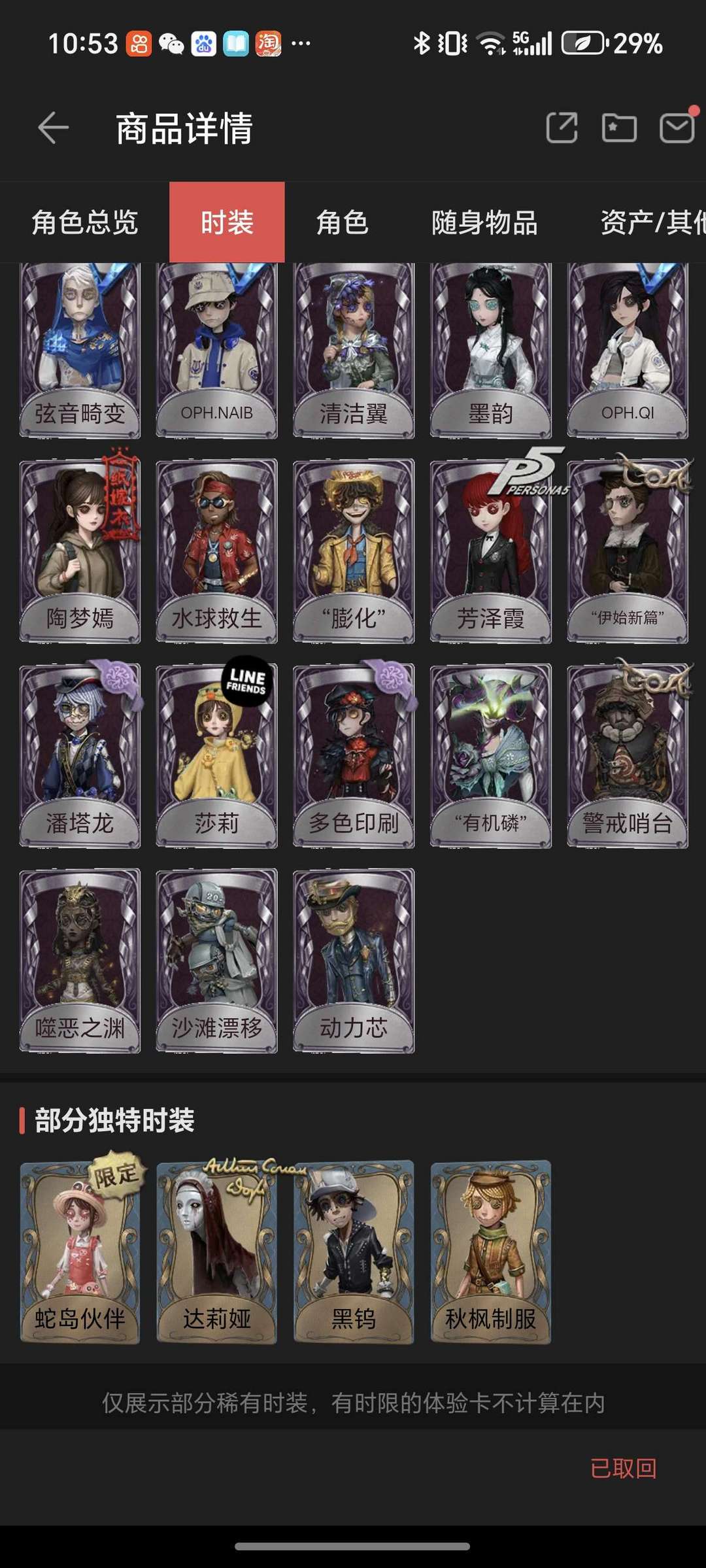 装备描述:气象限定金,多个推理紫,小女孩瑞吉儿滚滚伙伴,p5前锋舞女觉醒,三丽鸥全女皮,电竞系列熊猫系列bduck联动等多个联动紫和回声紫