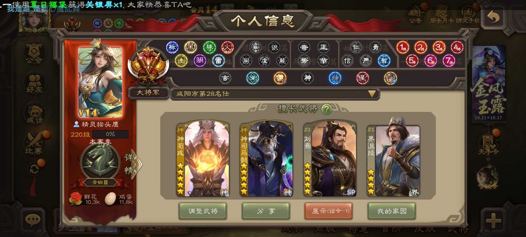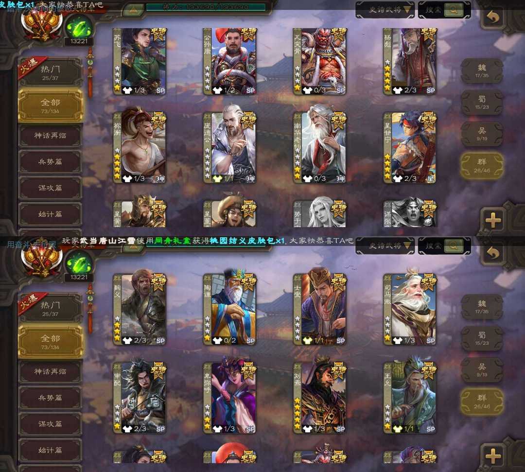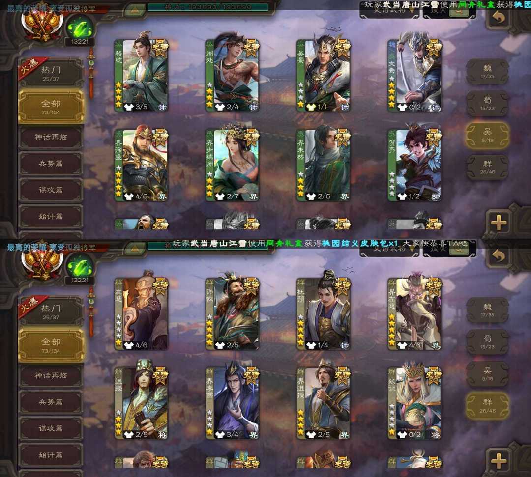限制: 租号1次及以上 |装备描述:魏:动态谋曹丕 界钟会 文鸯 界于禁 动态戏志才 sp司马昭 动态清河公主 蜀:谋关羽 界黄忠 张星彩 谯周 吴:周处 吴景 动态界徐盛 界步练师 贺齐 群:杜预 界沮授 张让 卑弥呼 动态刘焉 神:动态神司马懿 动态神陆逊 动态神甘宁 动态神荀彧